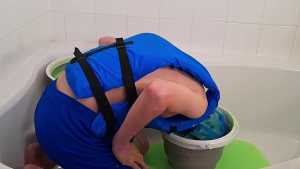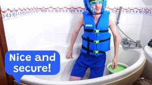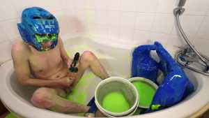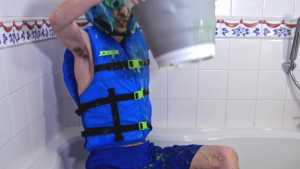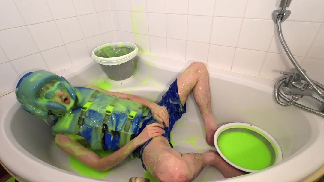 JellyKid has lost a red vs blue game of higher or lower, which means now he has to wear a ridiculous outfit consisting of a blue life jacket, shorts, Speedos, padded headgear and goggles whilst he gunges himself in thick green gunge.