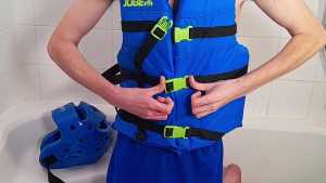 "JellyKid faces a green gunging in a padded lifejacket and headgear!"